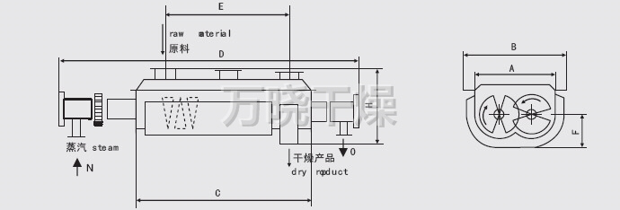 空心轴上密集排列着楔型中空浆叶,热介质经空心轴流经浆叶。单位有效容积内传热面积很大,热介质温度从-40℃到320℃,可以是水蒸汽,也可以是液体型:如热水、导热油等。间接传导加热,没有携带空气带走热量,热量均用来加热物料。热量损失仅为通过器体保温层向环境的散热。楔型浆叶传热面具有自清洁功能。物料颗粒与楔型面的相对运动产生洗刷作用,能够洗刷掉楔型面上附着物料,使运转中一直保持着清洁的传热面。浆叶干燥机的壳体为Ω型,壳体内一般安排二到四根空心搅拌轴。壳体有密封端盖与上盖,防止物料粉尘外泄而充分发挥作用。