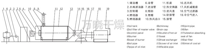 燃料通过燃烧器燃烧,产生高温燃气。并借助具有强化换热措施的热风炉将高温燃气的热量传导给被加热的空气,高温燃气经热量散发后温度降低至250℃后排到大气中。需加热的空气通过选配的鼓风机强送入热风炉,吸热后温度升至额定值从热风出口处送出,当热风温度达到额定温度上限时,燃烧器会自动停止燃烧或自动转为小火焰燃烧,当热风温度降低到额定下限温度时,燃烧器又会重新点燃运行或转为大火燃烧,升温的速度可以调节进风阀的开度来实现。